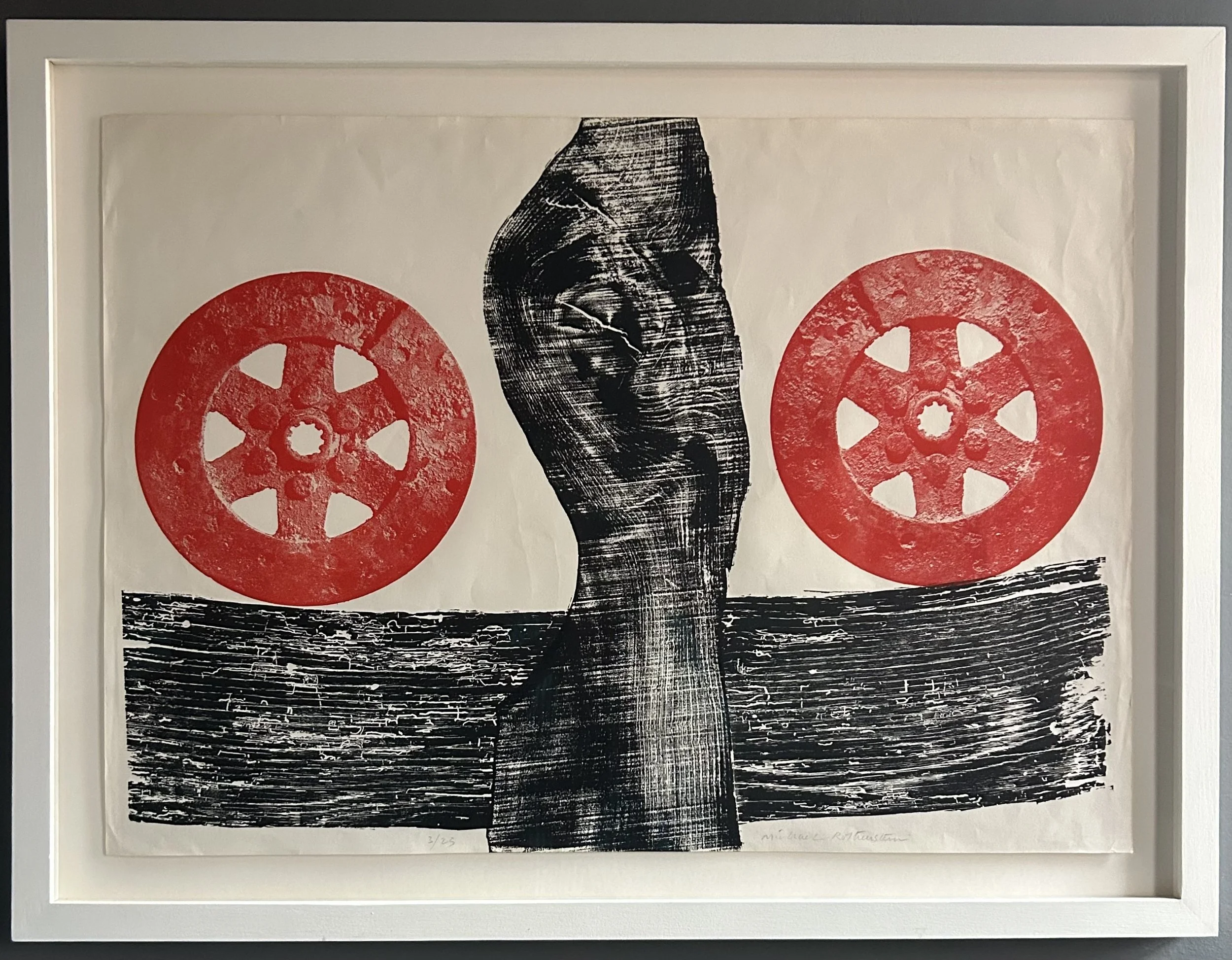 Above: Michael Rothenstein RA (1908-1993) The Wheel Takes Over (Red Wheels), 1968. Coloured woodcut & photo relief on paper. Edition 3/25. Made using found wood (floor boards). H:73 x W:96.5cms.