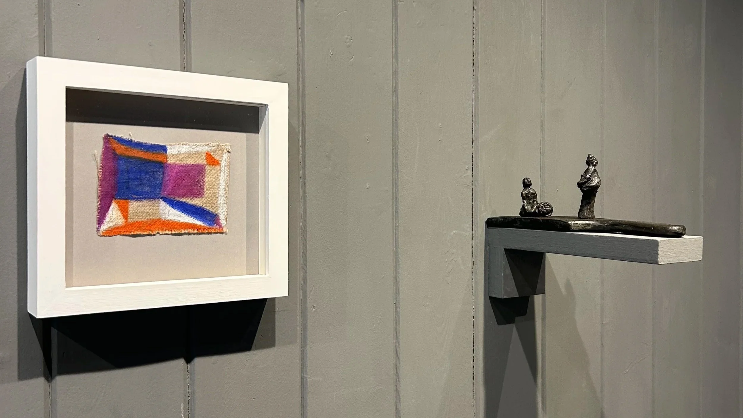 Above (to the left) Margaret Mellis (1914-2009)Untitled III, 1983. Raw pigment on canvas fragment. H:19 x W:20.5cms. Framed size. Above (to the right) Victoria Hussain The Gleaners, 2024. Lost wax process bronze cast. Edition 2/6.