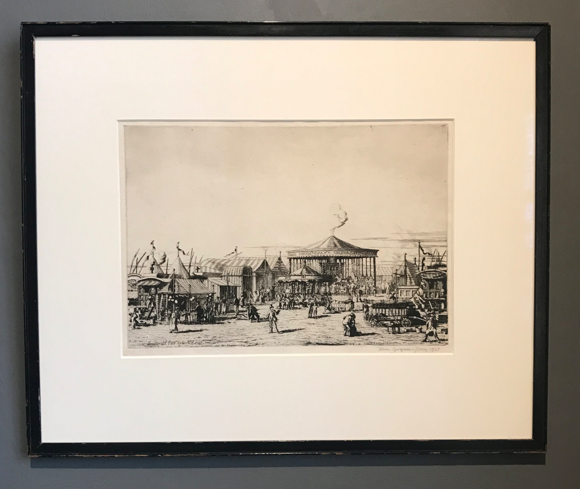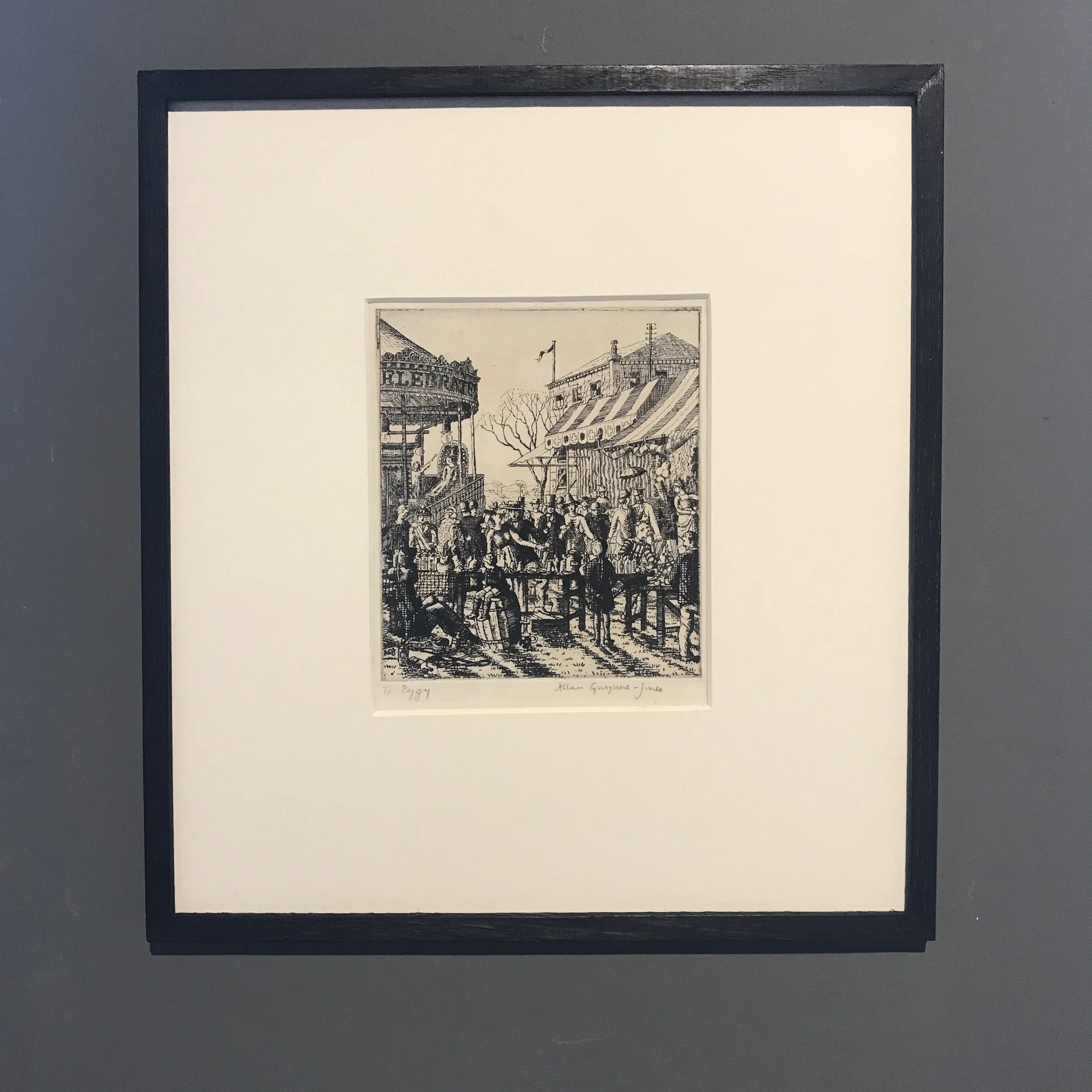 Above: Allan Gwynne-Jones CBE DSO RA NEAC (1892-1982) Southwold Fair 1912, 1927. Etching on paper. H:38.5 x W:46.5. Below: Allan Gwynne-Jones CBE DSO RA NEAC (1892-1982) Trinity Fair at Gunhill, Southwold, 1927. H:33 x W:30.5cms.