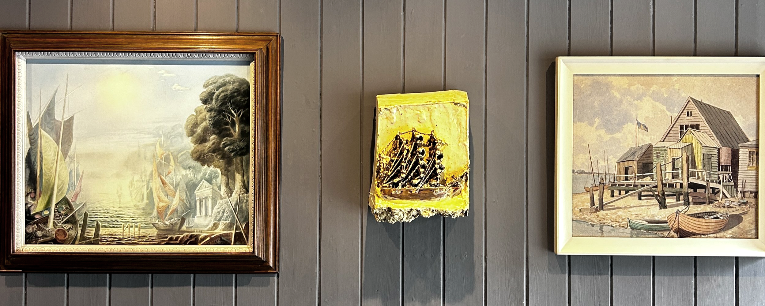 Above: Richard Elliott Blue Ship,2024. Mixed media on canvas. H:34 x W:36 x D:12cms.