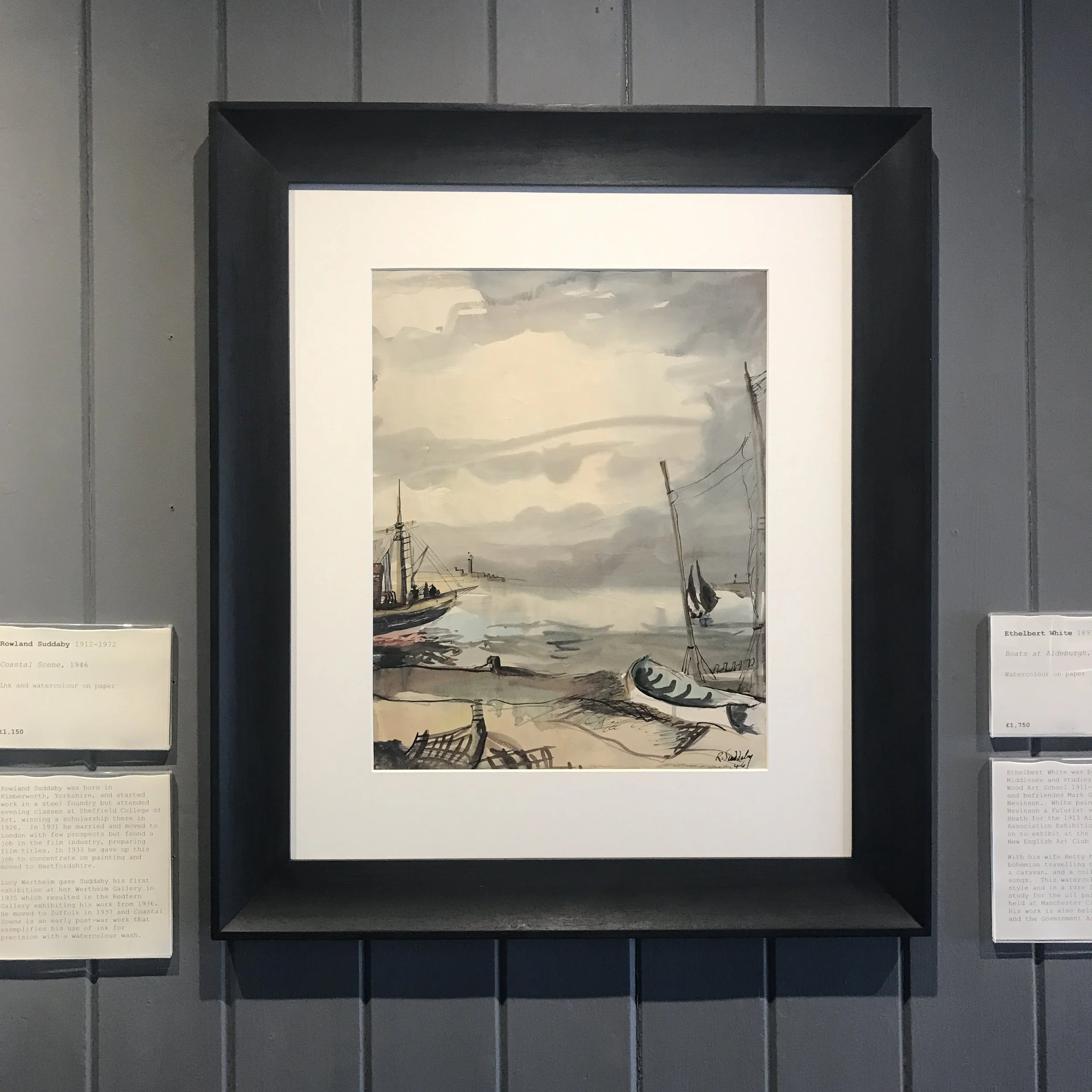 Lucy Wertheim gave Suddaby his first exhibition at her Wertheim Gallery in 1935 which resulted in the Redfern Gallery exhibiting his work from 1936. He moved to Suffolk in 1937 and Coastal Scene is an early post-war work that exemplifies his use of ink for precision with a watercolour wash.