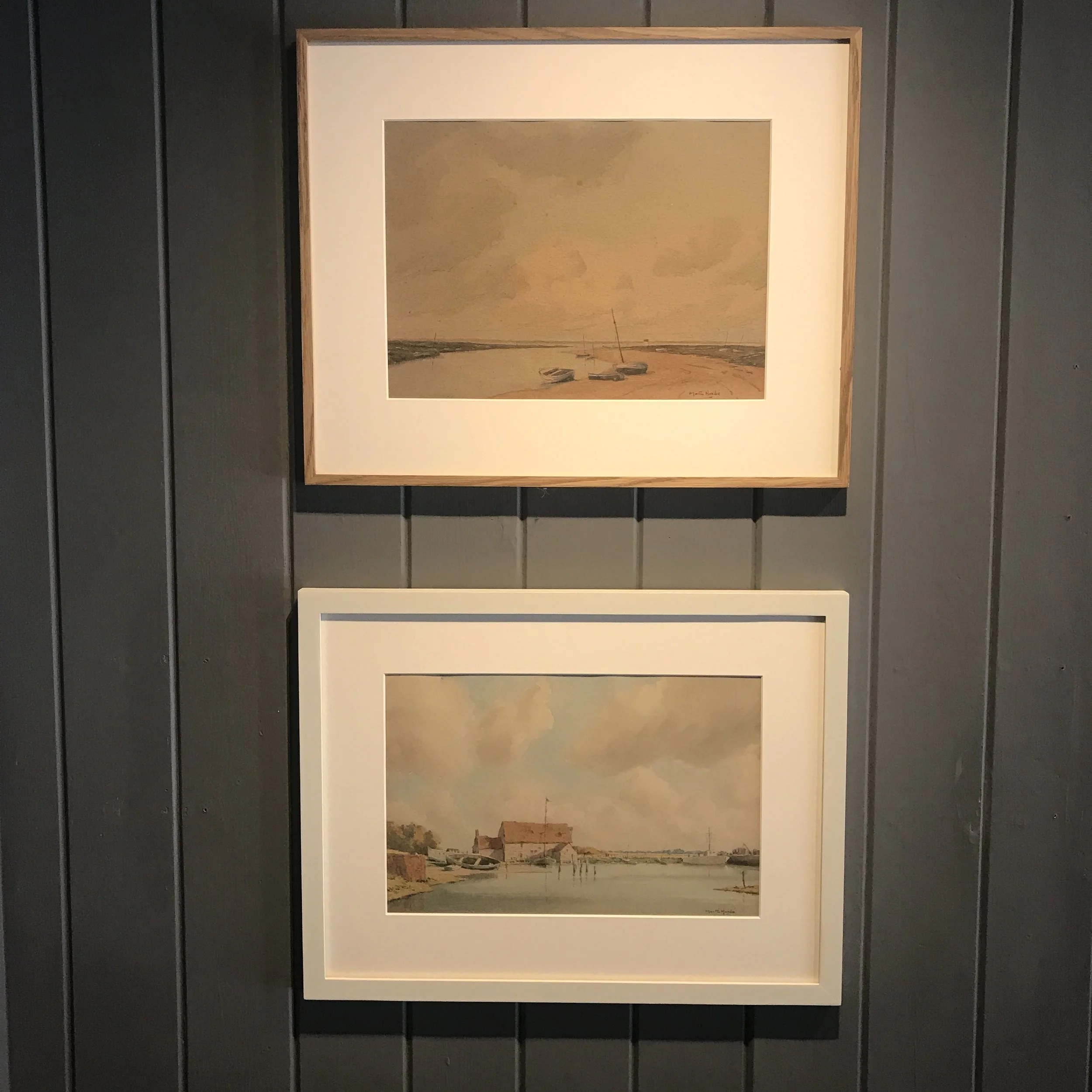 Above: Top - Martin Hardie RE (1875-1952) East Anglian Estuary, c.1930s. Watercolour on buff paper. H:41 x W:51cms Below:Martin Hardie RE (1875-1952) High Tide, St Osyth, Essex, 1947. Watercolour on paper. H:40 x W:52cms.